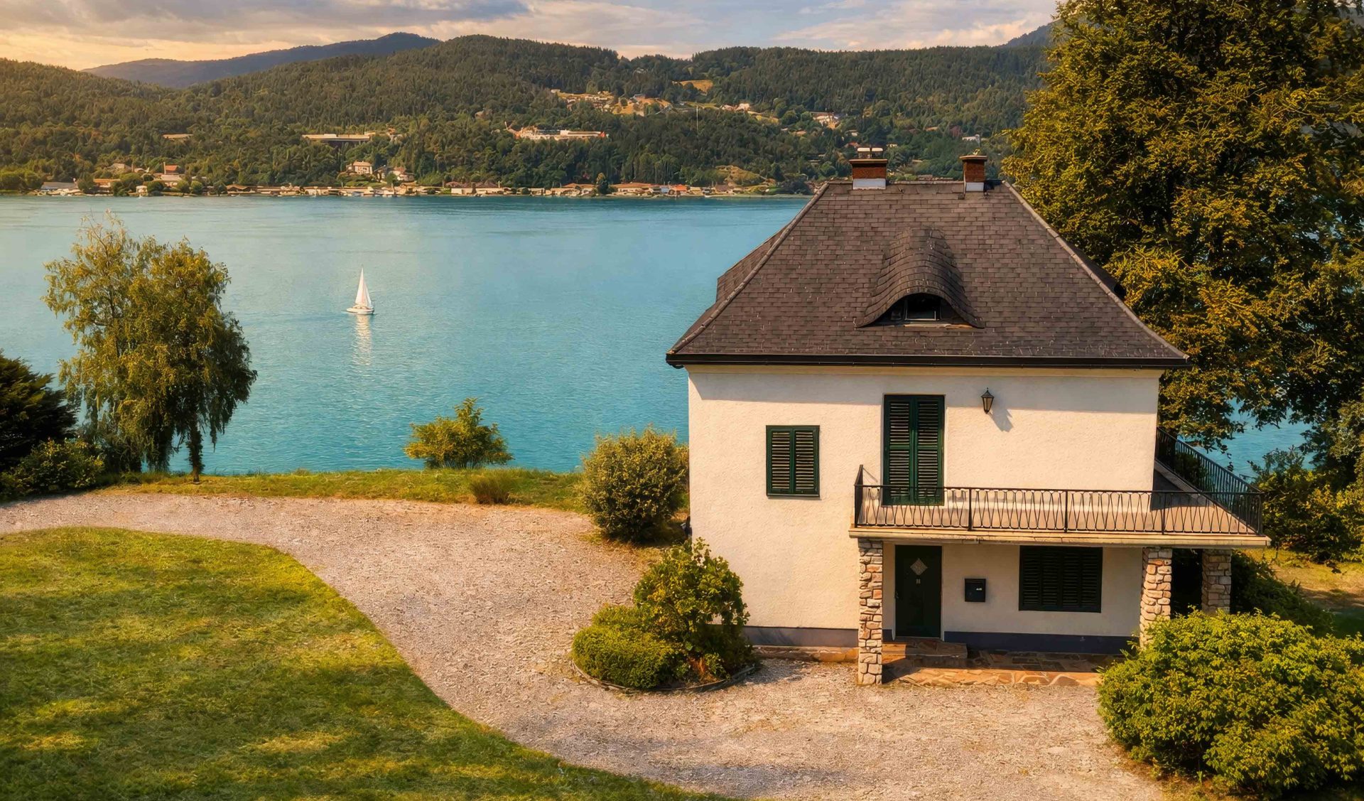 Dieses besondere Anwesen liegt auf einem malerischen Panoramaplateau am sonnigen Südufer des Wörthersees und bietet einen unvergleichlichen 180-Grad-Blick über das türkis schimmernde Wasser. Die ganztägige Sonneneinstrahlung und spektakuläre Sonnenuntergänge tauchen den See in goldenes Licht – ein Anblick, der jeden Tag aufs Neue fasziniert. Eingebettet in ein weitläufiges, idyllisches Grundstück garantiert die Villa absolute Privatsphäre und Ruhe.
