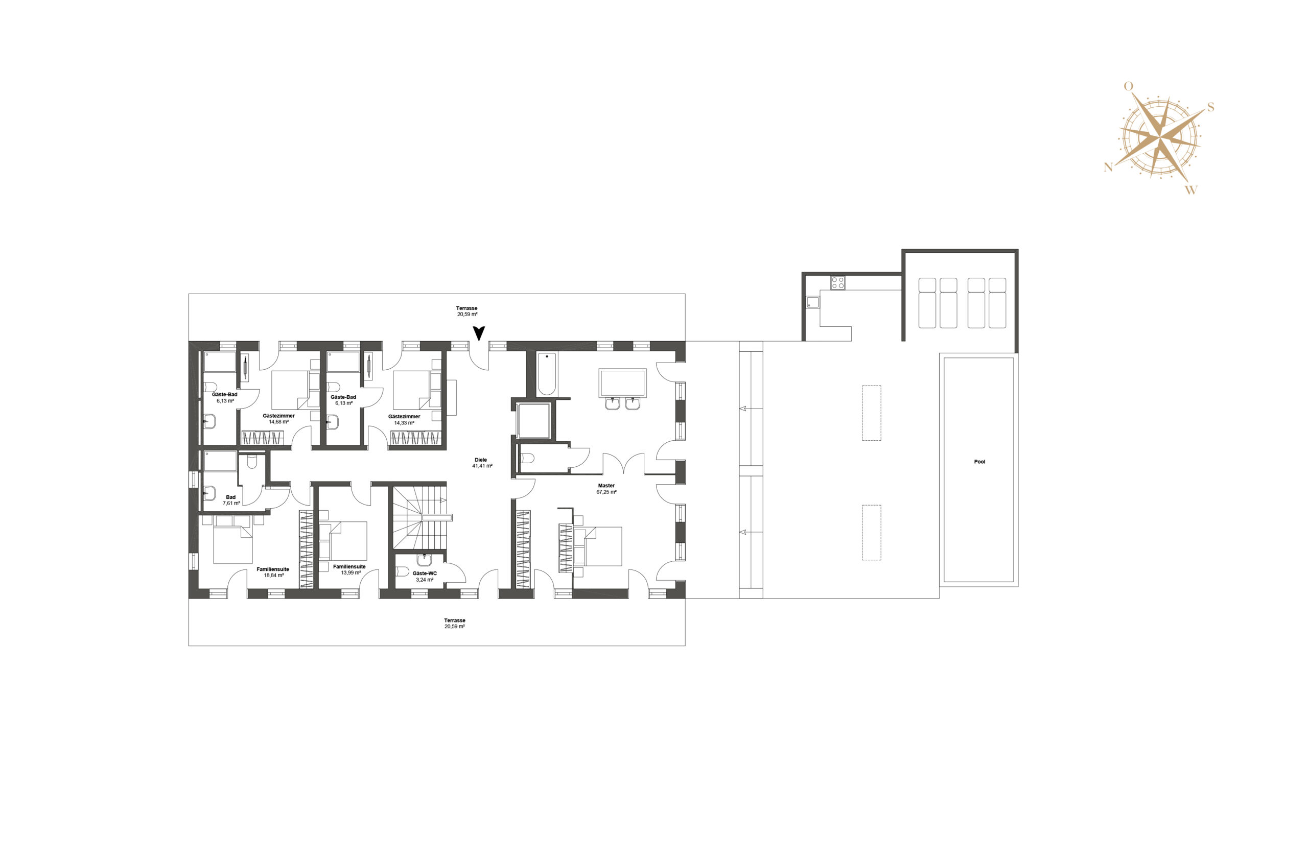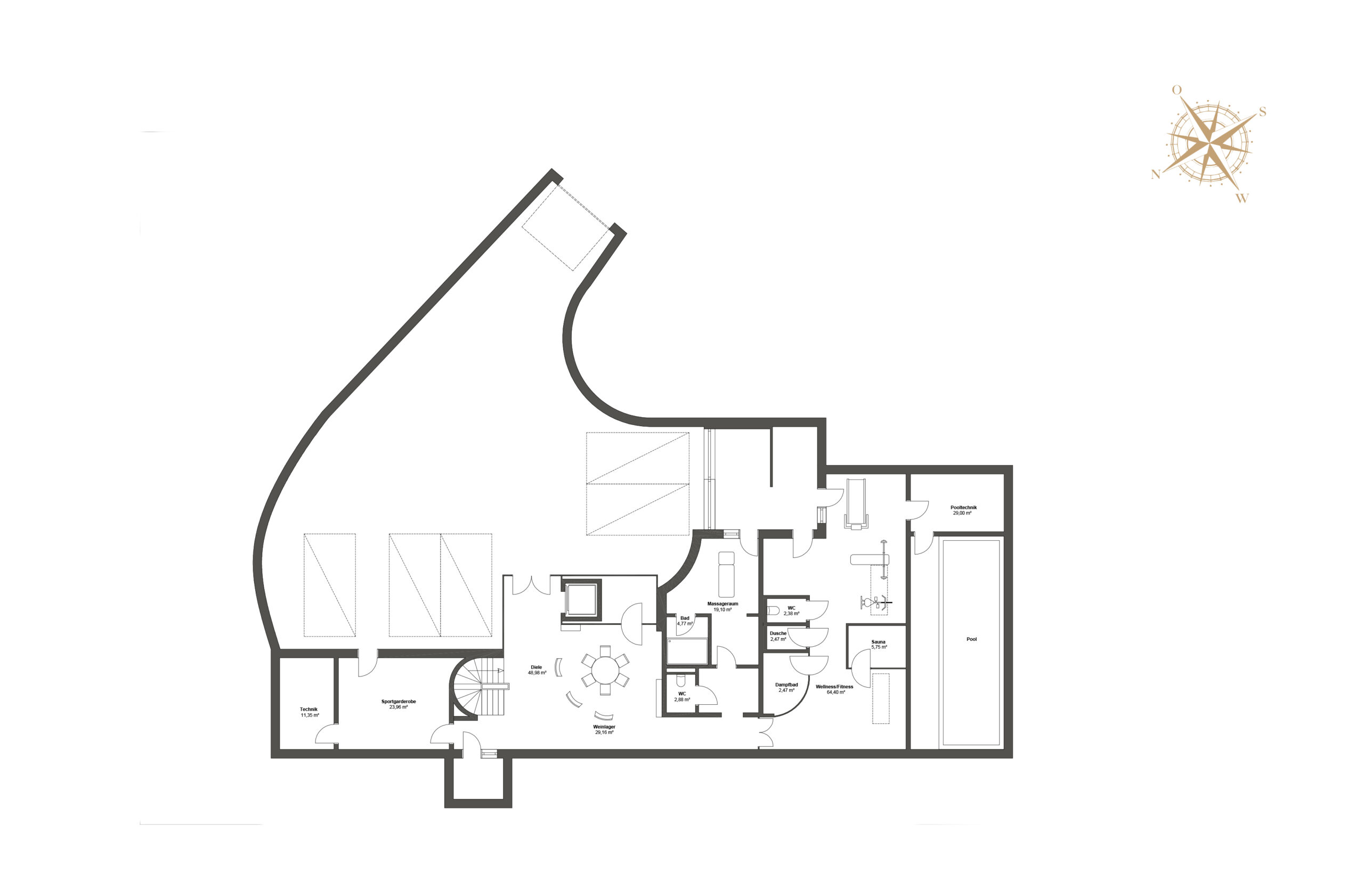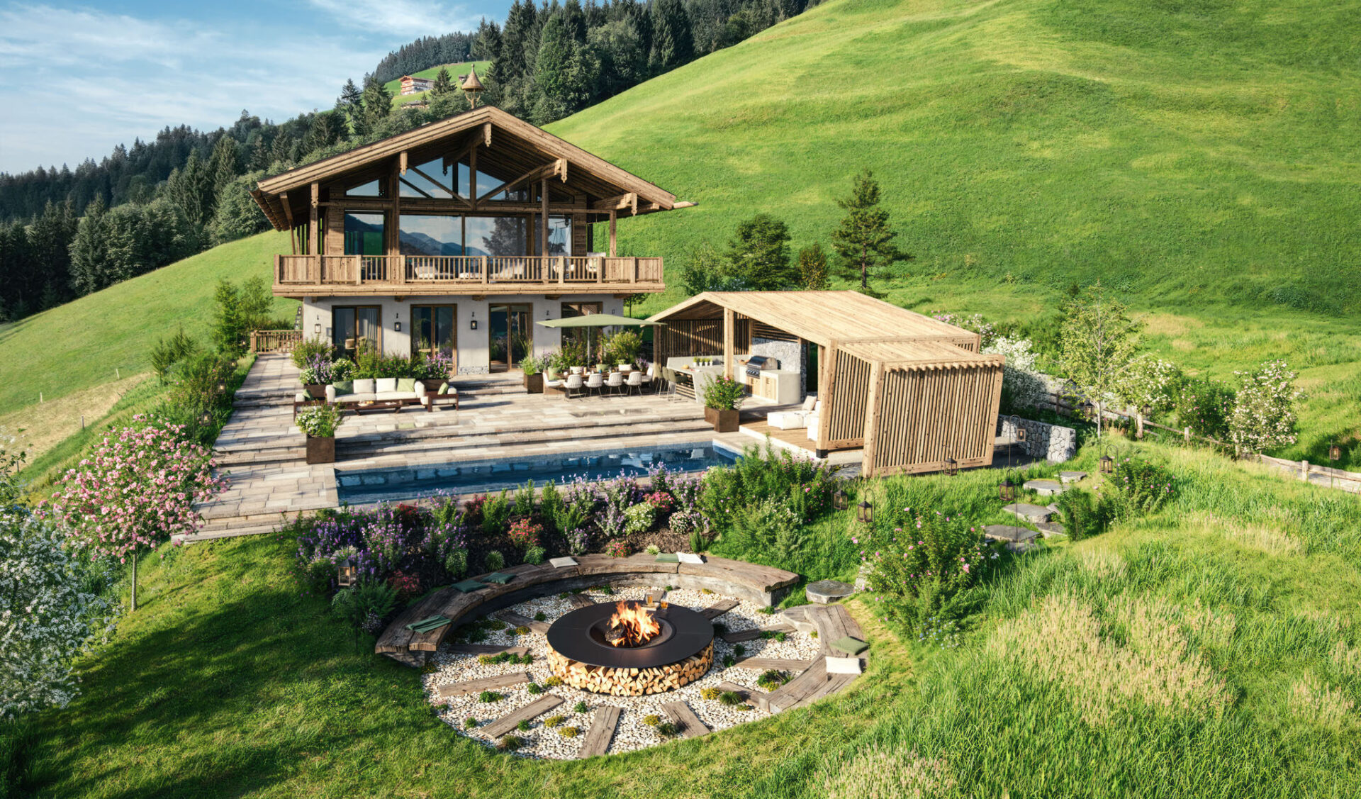 Ein besonderes Highlight sind die großzügig geplanten Außenbereiche mit Infinity-Pool, Poolhaus und Outdoor-Küche, die den Blick in die Berge eindrucksvoll inszenieren. Ergänzt wird das Konzept durch einen exklusiven Wellness- und Fitnessbereich mit Sauna, Dampfbad, Ruhe- und Massageraum.