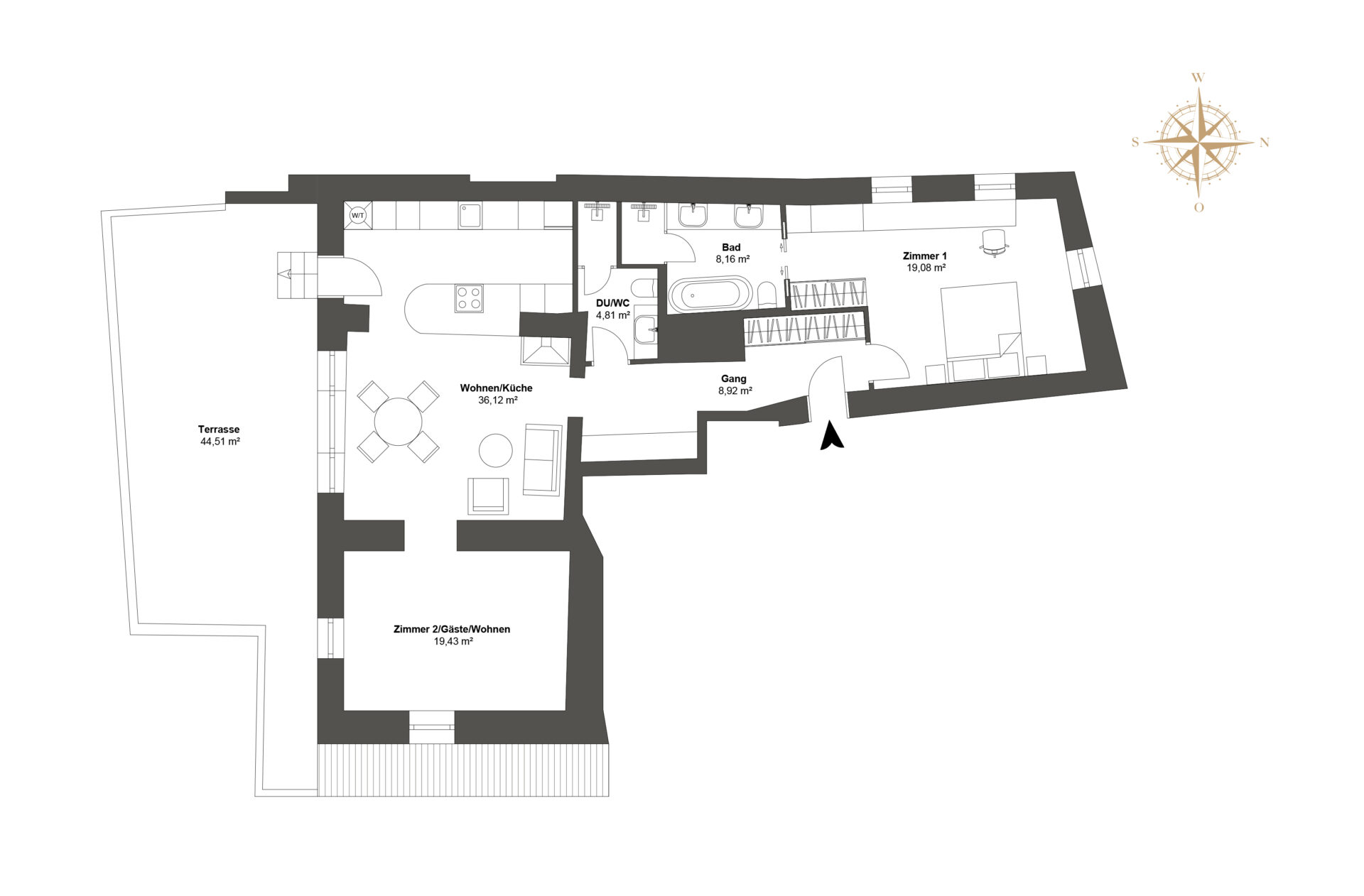 Luxussanierte Erstbezugswohnung nach High-End-Kernsanierung im Herzen von Kitzbühel in einem historischen Haus mit nur sieben Einheiten. Die Lage ist einzigartig: nur wenige Schritte zur Fußgängerzone und Hahnenkammbahn, mitten in der charmanten Gamsstadt. Die Wohnung bietet auf ca. 104 m2 einen großzügigen Wohn- und Essbereich mit elegantem Gaskamin, der zum Entspannen einlädt. Zwei lichtdurchflutete Schlafzimmer dienen als ruhige Rückzugsorte. Besonders hervorzuheben sind die zwei großzügigen Sonnenterrassen sowie ein kleiner Gartenanteil, die das Wohnen ins Freie erweitern.