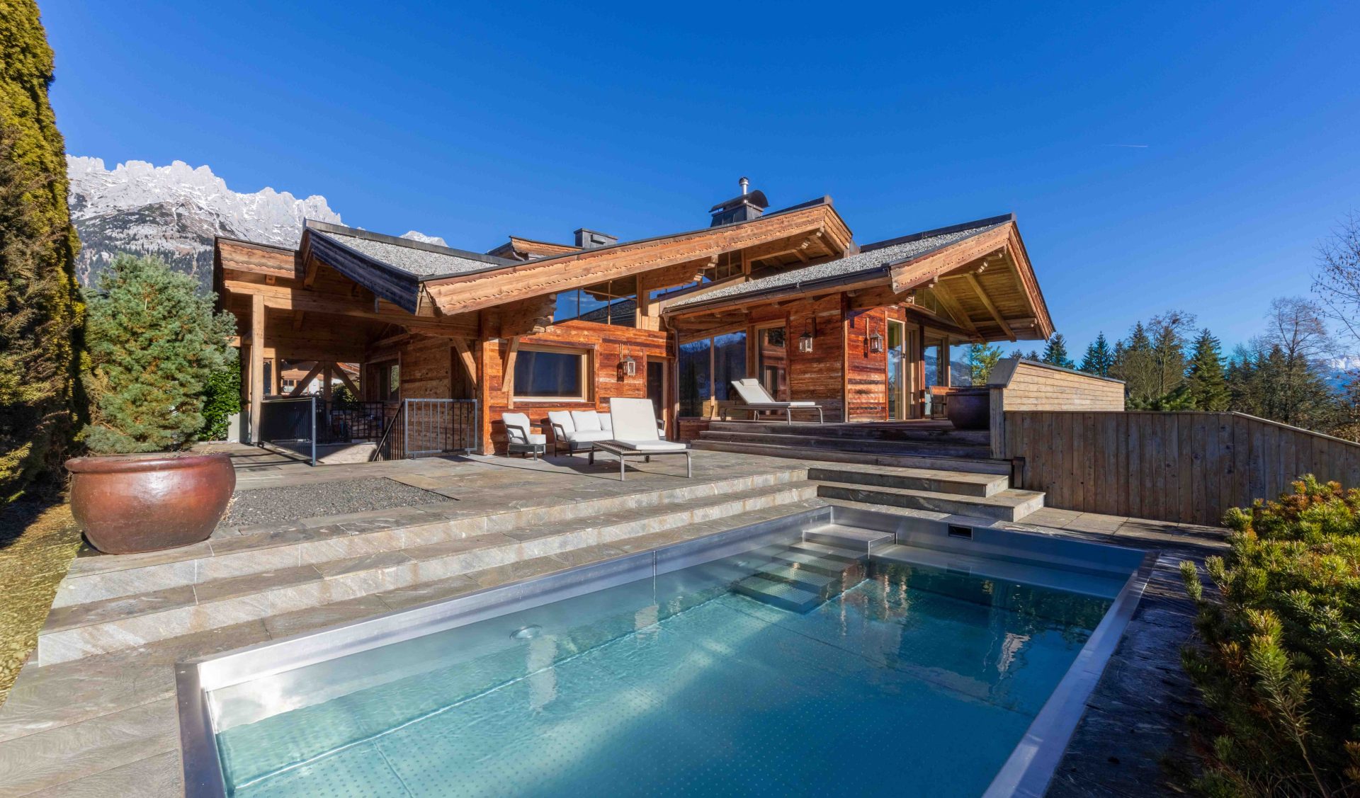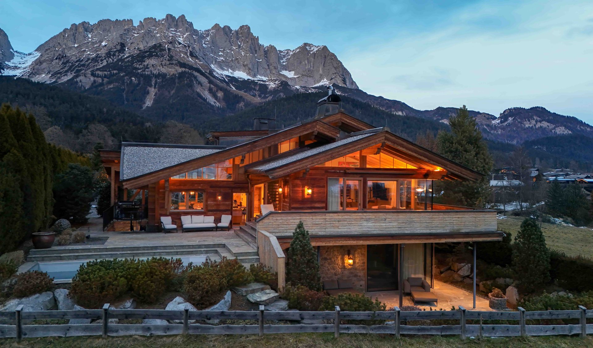In absoluter Bestlage von Going am Wilden Kaiser präsentiert sich dieses außergewöhnliche Luxuslandhaus als harmonische Symbiose aus alpiner Architektur, zeitloser Eleganz und modernem Wohnkomfort. Umgeben von einer beeindruckenden Naturlandschaft und mit freiem Blick auf das majestätische Kaisergebirge erfüllt diese Immobilie höchste Ansprüche an Exklusivität, Privatsphäre und Lebensqualität. Das Herzstück des Hauses bildet der großzügige, repräsentative Wohn- und Essbereich mit offener Designerküche. Großflächige Panoramaverglasungen lassen Innen- und Außenraum nahtlos miteinander verschmelzen und eröffnen ein atemberaubendes Bergpanorama.