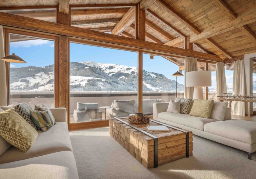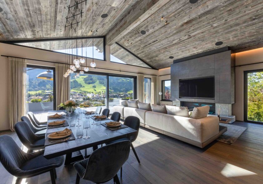 Dieses außergewöhnliche Penthouse beeindruckt mit einer großzügigen Wohn-Nutzfläche von ca. 248 m² sowie weitläufigen Sonnenterrassen und Balkonen, die atemberaubende Ausblicke auf die Kitzbüheler Alpen und die legendäre Streifabfahrt bieten. Ein frei sichtbarer Altholz-Dachstuhl verleiht dem Wohnraum eine einzigartige Atmosphäre und setzt das stilvolle Design perfekt in Szene.