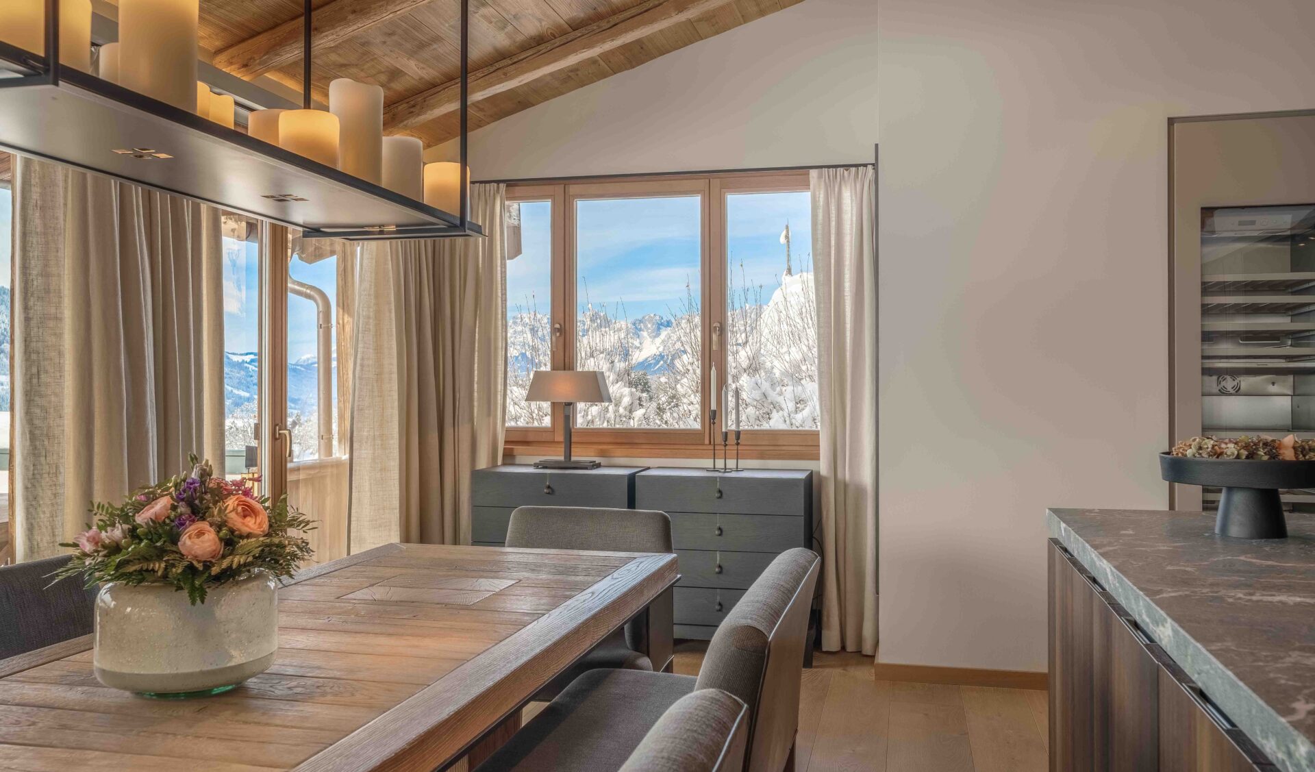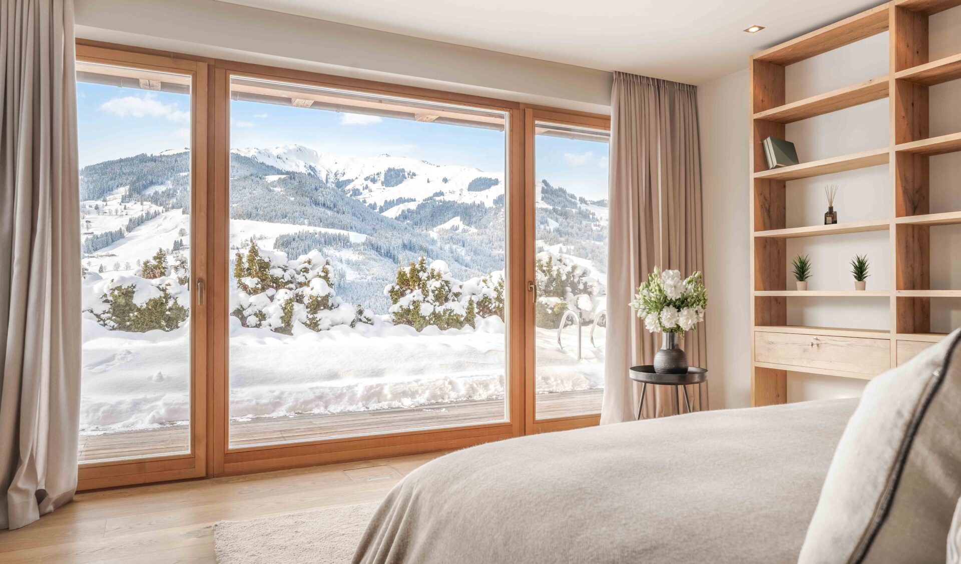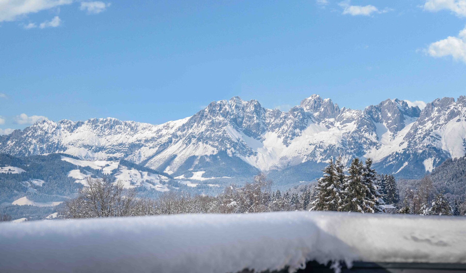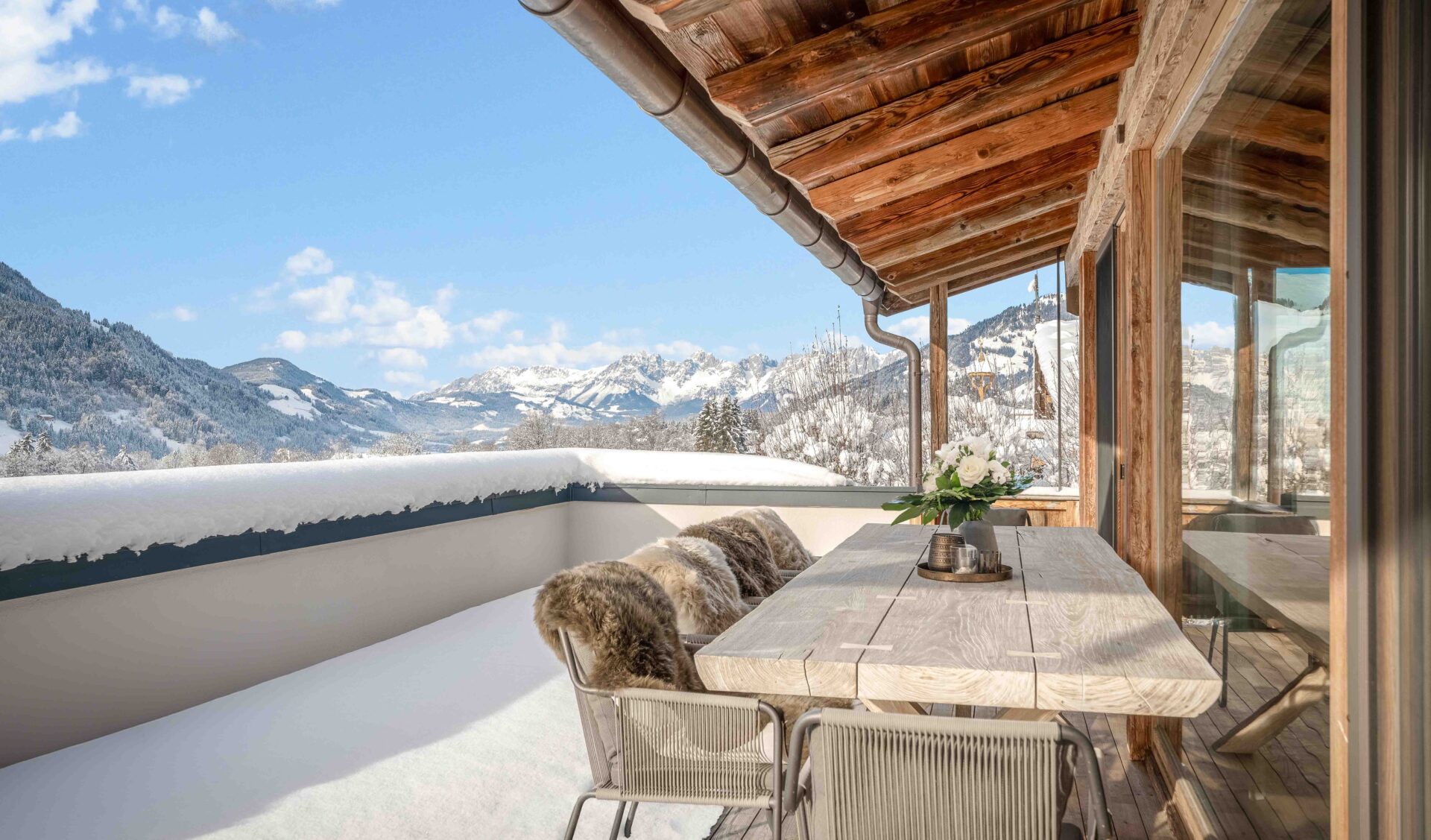 Die großen Fensterfronten im Wohnbereich bieten einen atemberaubenden Rundumblick auf die Kitzbüheler Bergwelt, besonders hervorzuheben ist der unvergleichbare Ausblick auf den Wilden Kaiser. Ein großzügiger Wellnessbereich mit Sauna und Dampfbad im Erdgeschoss und ein beheizter Außenpool bieteten Erholung und Entspannung.
