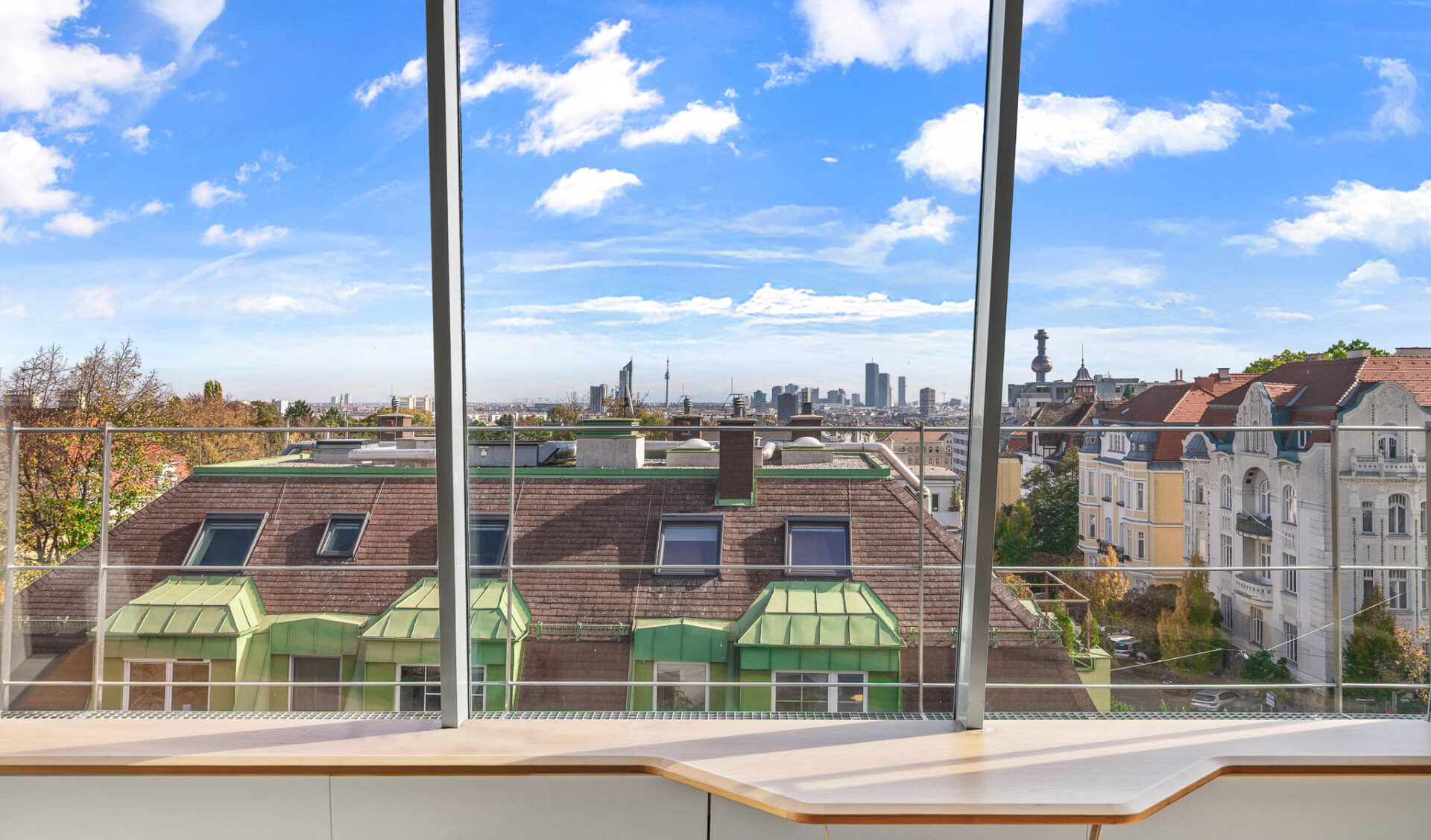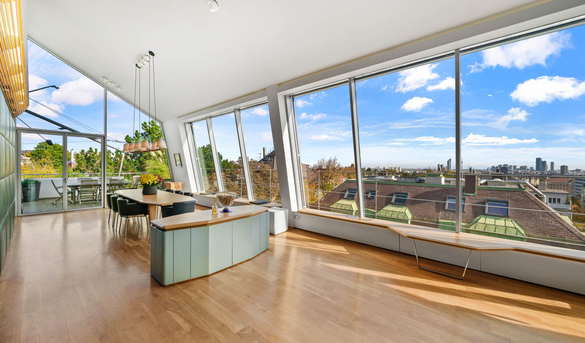 Die fast 16 Meter lange Atelierverglasung durchzieht den lichtdurchfluteten Wohnraum wie ein gläsernes Band und öffnet sich zu einer Terrasse mit spektakulärem Panoramablick über die Stadt. Schon beim Betreten der Wohnung fällt der Blick durch den beidseitig verglasten Kamin direkt auf die Skyline von Wien.